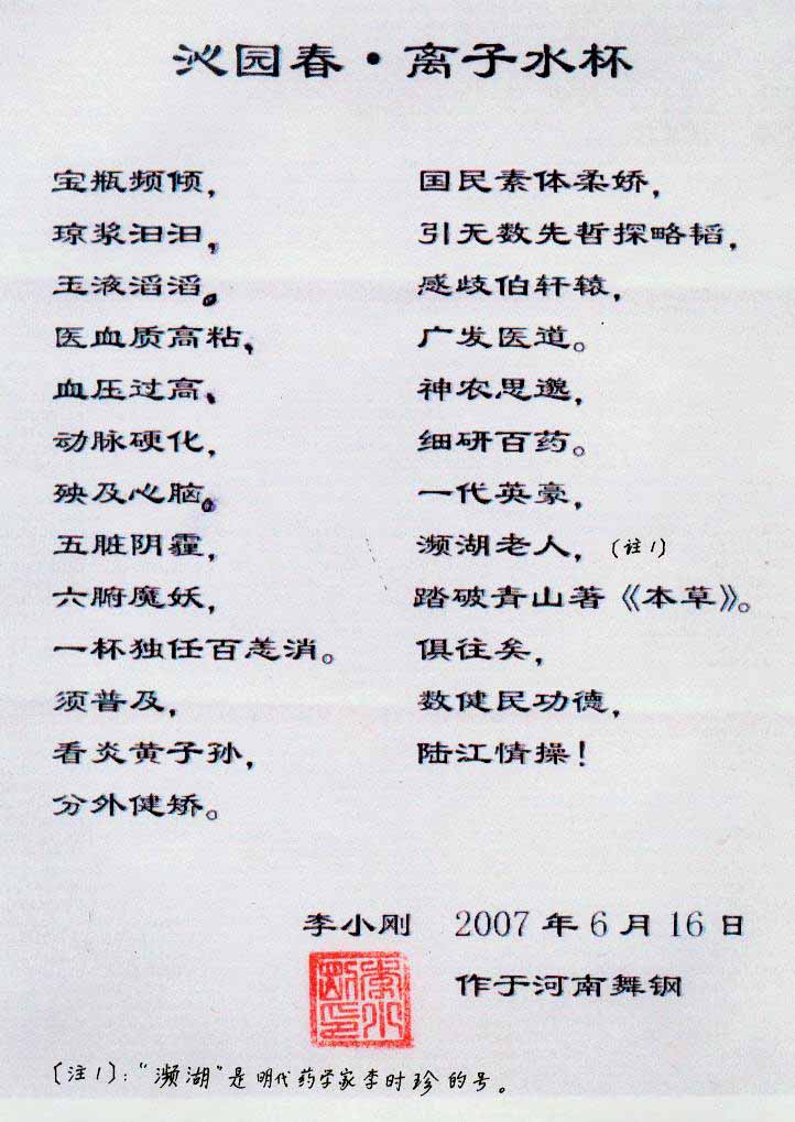 -----我是從事建筑的高工,本來沒有資格去攻克醫(yī)學(xué)難題,卻為了自身健康才扣響醫(yī)學(xué)的大門。由于我1990年患高血壓,因怕中風(fēng)才研究發(fā)明了離子水瓶,我把水處理成微小分子團(tuán)水,飲用后治愈了高血壓。便于1993年底送到三家省級醫(yī)院做臨床試用4個月。經(jīng)北京和廣西醫(yī)學(xué)專家鑒定:"降脂降壓效果好"," 能擴(kuò)大心腦動脈流量,改善心腦電圖以及微循環(huán)","對治療心腦動脈粥樣硬化、高血壓、高血脂有良好的醫(yī)療保健作用。""產(chǎn)品的技術(shù)性能和療效達(dá)到了同類產(chǎn)品的國內(nèi)領(lǐng)先水平,經(jīng)廣西醫(yī)學(xué)科學(xué)情報研究所檢索,未見國外有類似報道。"中國醫(yī)學(xué)科學(xué)院張正國教授從美國國立醫(yī)學(xué)圖書館數(shù)據(jù)庫存Medline檢索英俄文資料,均未見類似報告。2000年上市后,我為了對消費者負(fù)責(zé)而繼續(xù)觀察研究,一直通過《信譽(yù)卡》和《質(zhì)量跟蹤調(diào)查書》向患者承諾療效,請用戶使用6個月后反饋效果。和脂壓患者飲用2至5個月內(nèi),消除癥狀,停服藥物,血壓正常;冠心病患者飲用3~5個月逐漸減輕至消除心絞痛、房顫等癥狀,不再服藥,飲用1年左右心電圖正常,經(jīng)冠脈造影掃描無明顯狹窄,表明冠心病痊愈。大量患者還反映許多衰弱器官被修復(fù),讓前列腺增生、慢性咽喉炎、慢性氣管炎、支氣管炎、慢性胃炎、腸炎和膽囊炎等不藥而愈;2型糖尿病患者是因為胰島衰弱致病,飲用該水半年至一年,逐漸減藥至停藥,血糖尿糖正常,真正治愈2型糖尿病。中風(fēng)后遺癥患者飲用六七個月,可逐漸減輕至消除肢體和語言障礙,表明飲用該水能讓壽命很長的神經(jīng)元細(xì)胞逐漸修復(fù),奇跡般地恢復(fù)肢體和語言功能。飲用后還使胸腺和脾臟兩個重要的免疫器官被修復(fù)和增強(qiáng),產(chǎn)生免疫細(xì)胞多,提高了免疫力,使人不生病或少生病。自此, 飲用微小分子團(tuán)水創(chuàng)造了攻克冠心病、高(低)血壓和糖尿病三大醫(yī)學(xué)難題的奇跡。人們對此感到不可思議,但實踐是檢驗真理的唯一標(biāo)準(zhǔn)。