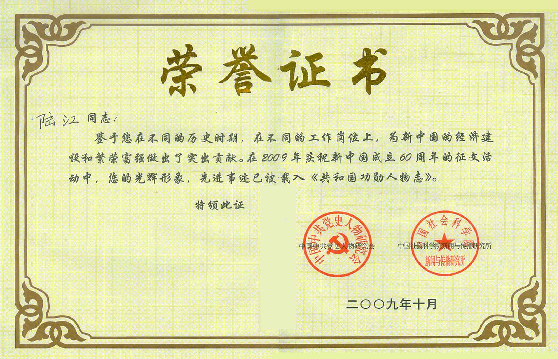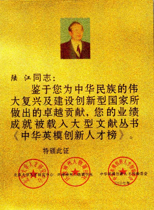 陸江的杰出貢獻(xiàn)被人民日報社評為先進(jìn)個人